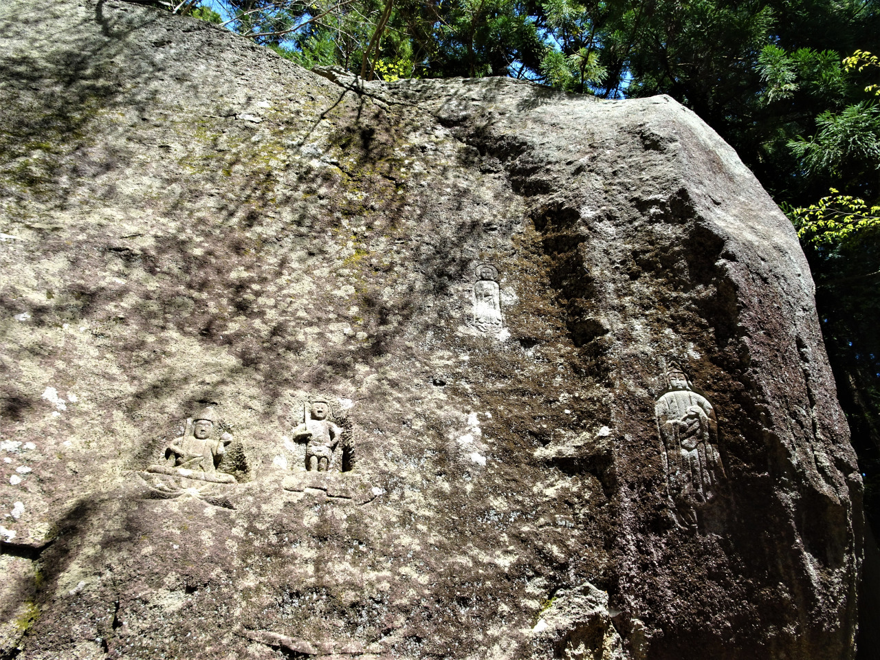 岩肌に大日如来・阿弥陀如来・文殊菩薩・聖観音菩薩・地蔵菩薩・不動明王・虚空蔵菩薩の七体が刻まれており、肉眼でも拝むことができます。