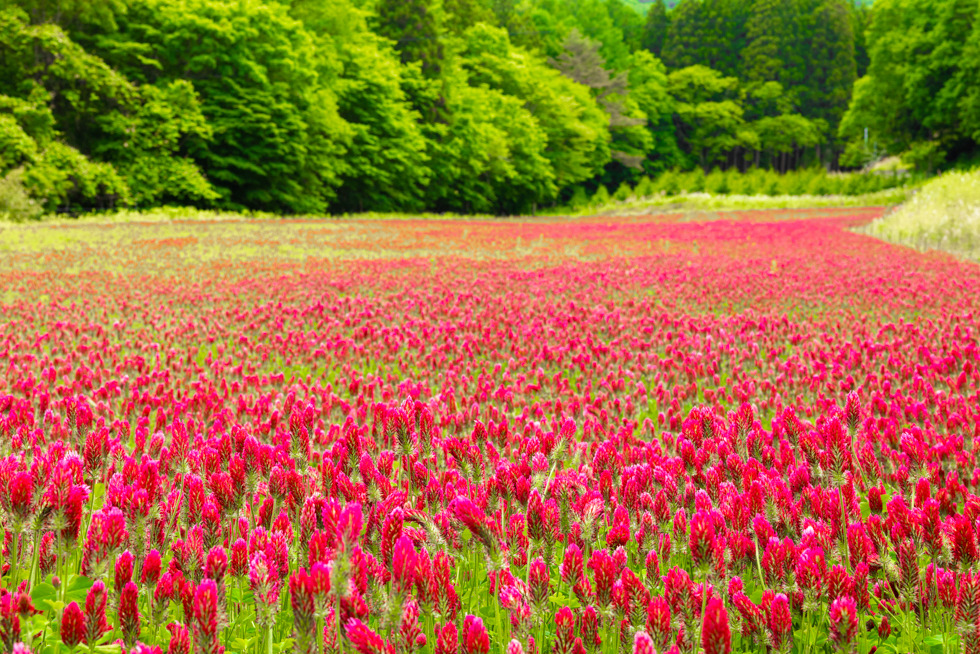 葛尾村の初夏を彩るクリムゾンクローバー。