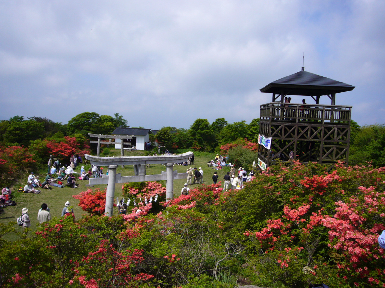 山頂には三つの神社があり、その一つの日山神社には疫病を退散させたという牛頭天皇(ごずてんのう)が祀られていることから、天王山(てんのうやま)の別名でも親しまれています。